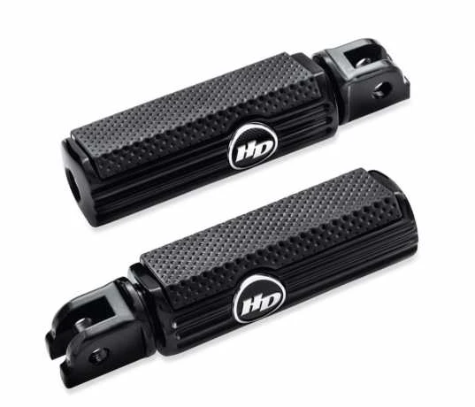 Diese Fußrasten von Harley-Davidson sind durch Ihre Kurven definiert. Die komplette Kollektion der Steuerelemente verfügt über ein reichhaltiges schwarzes Finish. Das Design beinhaltet ein Design aus texturiertem schwarzen Gummi, das mit tiefen Längslinien und einem zeitgenössischen Harley-Davidson Logo ausgestattet ist.