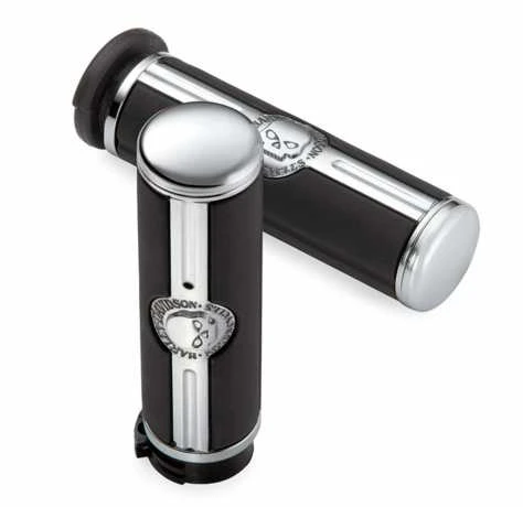 Mit dem finsteren, mit dem „Harley-Davidson“ Schriftzug umrahmten Totenkopf-Logo aus Chrom kontrastierend, sorgen die erhabenen Gummiauflagen für gute Griffigkeit und Langstreckenkomfort.